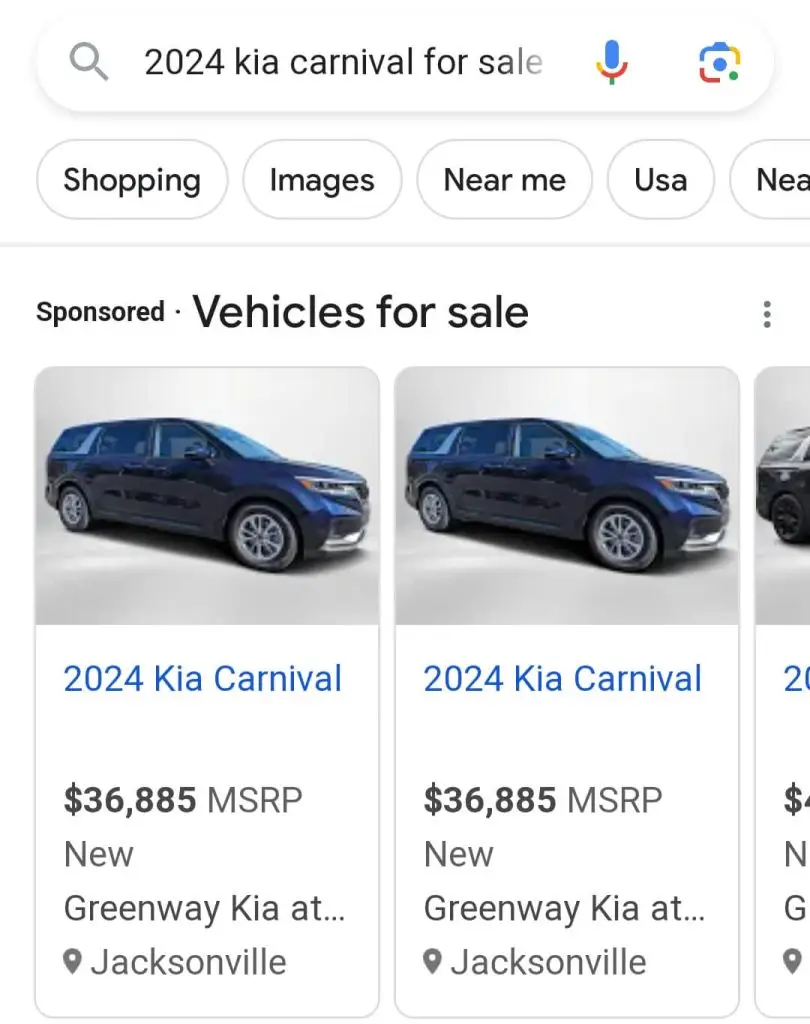 VLA’s are mostly shown at the very top of a Google search results page, other times they can be found a little further down the page. VLA’s are Google’s way of competing with classified sites like cars.com and Auto Trader. This is Google’s answer to showcasing your new or used inventory right at the shopper’s fingertips or mouse cursor. The user no longer has to click on a classified site to see the vehicles that you have for sale.